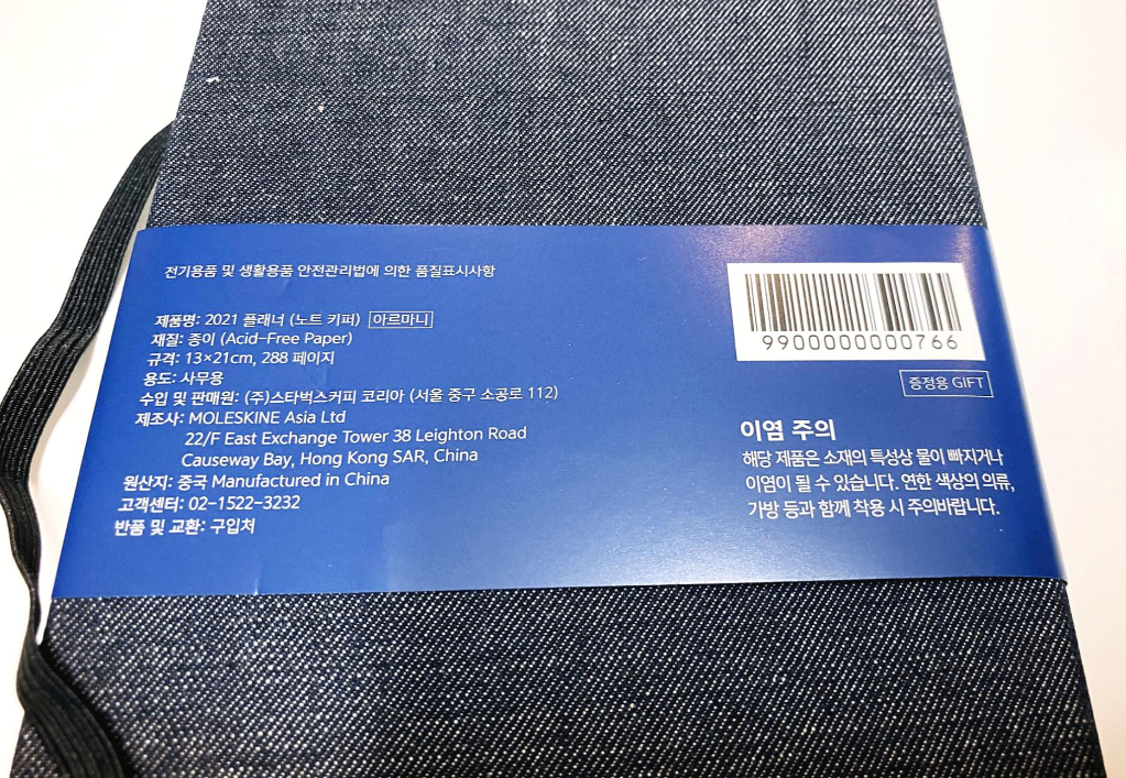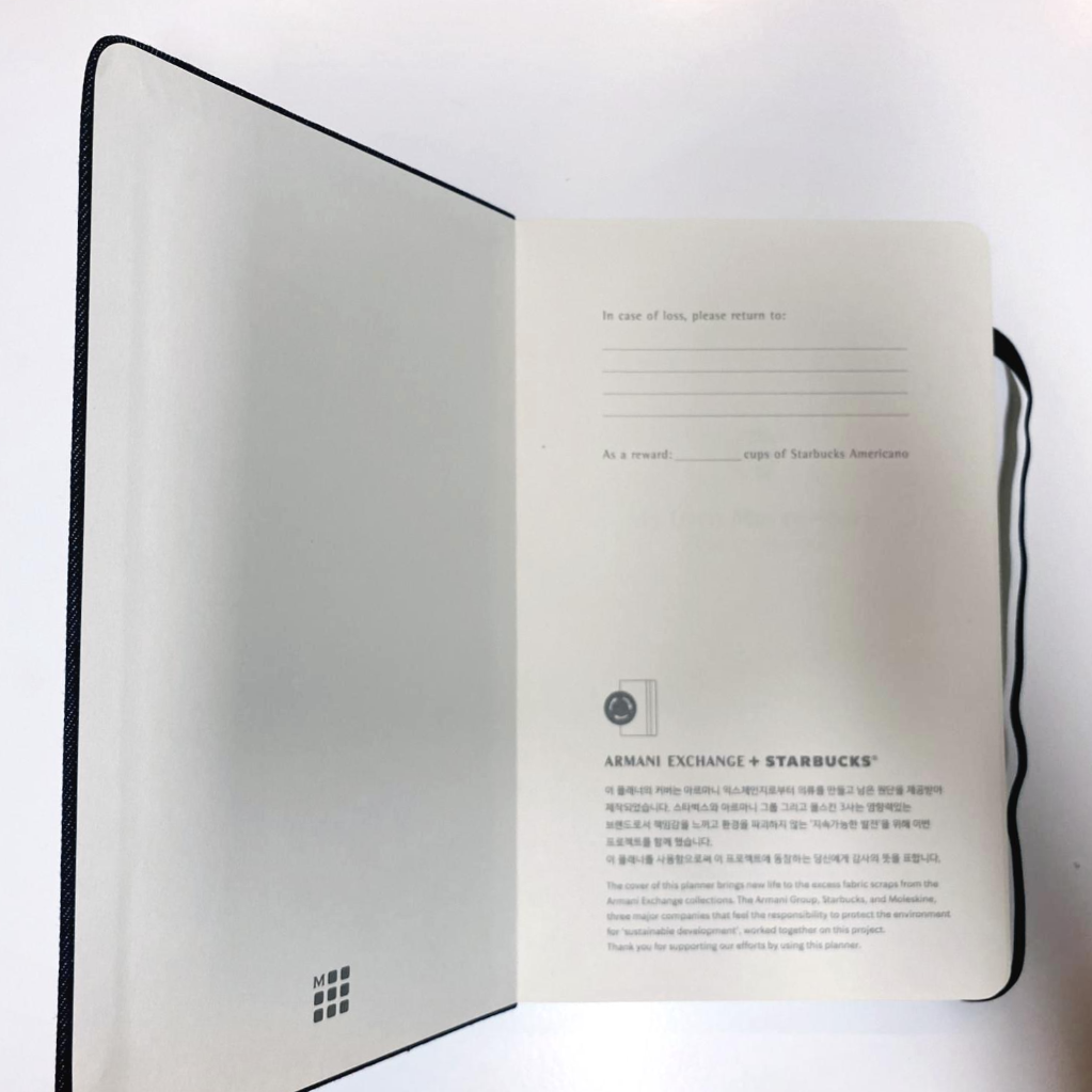 사진이 흐려서 잘 안보이는데, 스타벅스와 아르마니 익스체인지, 몰스킨 3개 회사가 환경을 보호하는 의도로 제작하고 남은 원단을 가공하여 다이어리로 만들었다고 한다. 스타벅스와 아르마니 익스체인지가 콜라보한 다이어리의 특징이 뭘까 궁금했는데, 첫장에서 해소되었다.