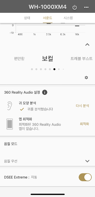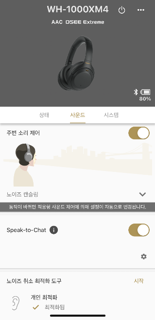 그리고 적응형 사운드 제어를 활성화해놓으면 사용자의 상태를 분석해서 노이즈캔슬링 상태를 조절해준다. 나는 대부분 집에서 가만히 앉아서 듣고 있어서 노이즈캔슬링 성능이 최대화로 활성화되는데, 한번 청소하면서 쓰고 있었더니 걷는 걸 인식해서 노이즈캔슬링을 조금 낮춰줘서 주변 소리를 들을 수 있게 해주었다. 이때 청소기소리가 안들리다가 갑자기 들려서 뭐지 오작동인가 했다가 노이즈캔슬링 성능을 다시 한번 실감할 수 있었다. 어서 빨리 비행기에서 써보고 싶다는 생각이 들었다.